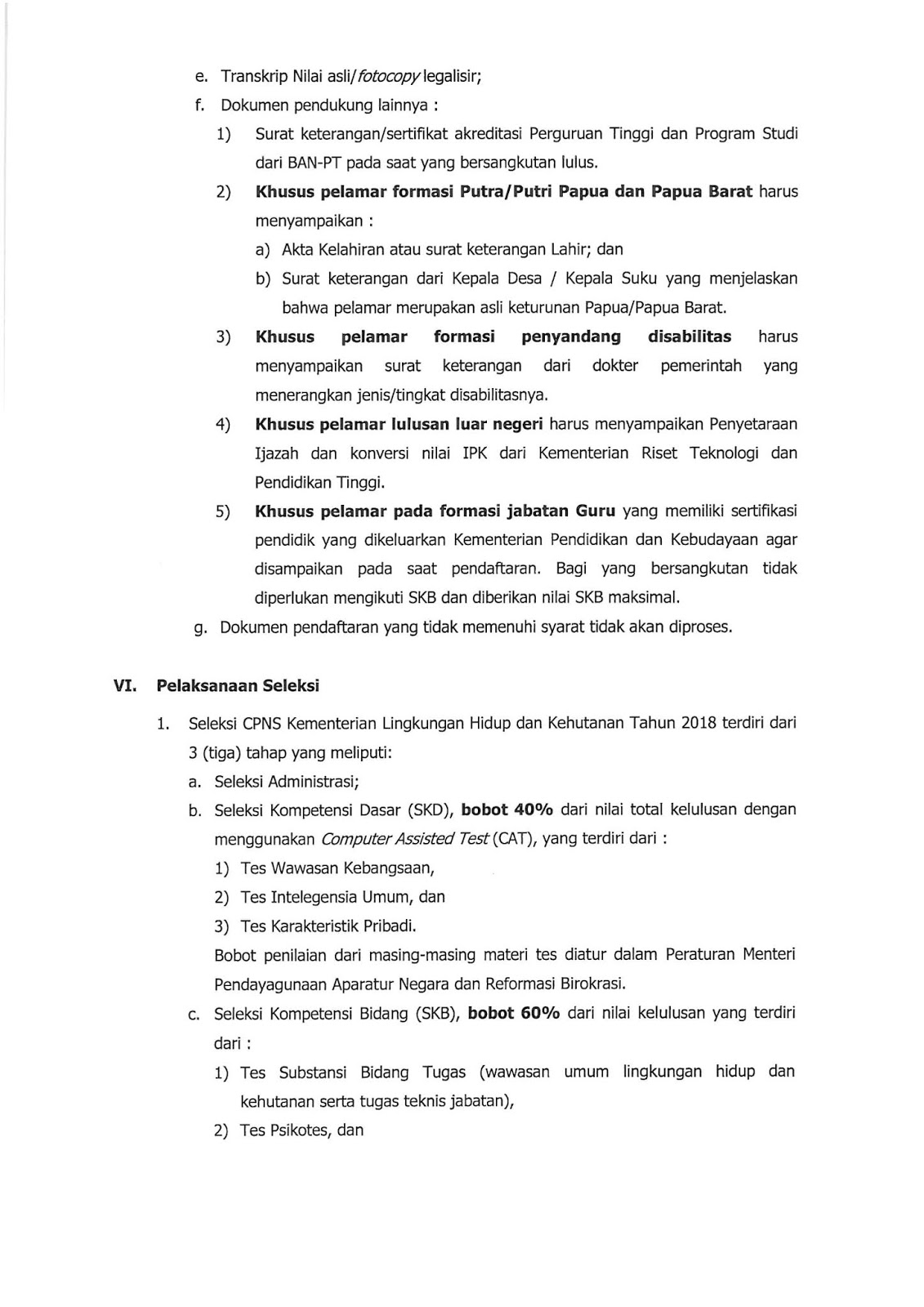 Berdasarkan Keputusan Menteri Pendayagunaaan Aparatur Sipil Negara dan Birokrasi Nomor 52 Tahun 2018 tentang Kebutuhan Pegawai Aparatur Sipil Negara di Lingkungan Kementerian Lingkungan Hidup dan Kehutanan Tahun Anggaran 2018, bersama ini Kementerian Lingkungan Hidup dan Kehutanan membuka kesempatan kepada Warga Negara Indonesia untuk menjadi Calon Pegawai Negeri Sipil (CPNS) yang akan ditugaskan di unit lingkup Kementerian Lingkungan Hidup dan Kehutanan di seluruh Indonesia dengan ketentuan sebagai berikut