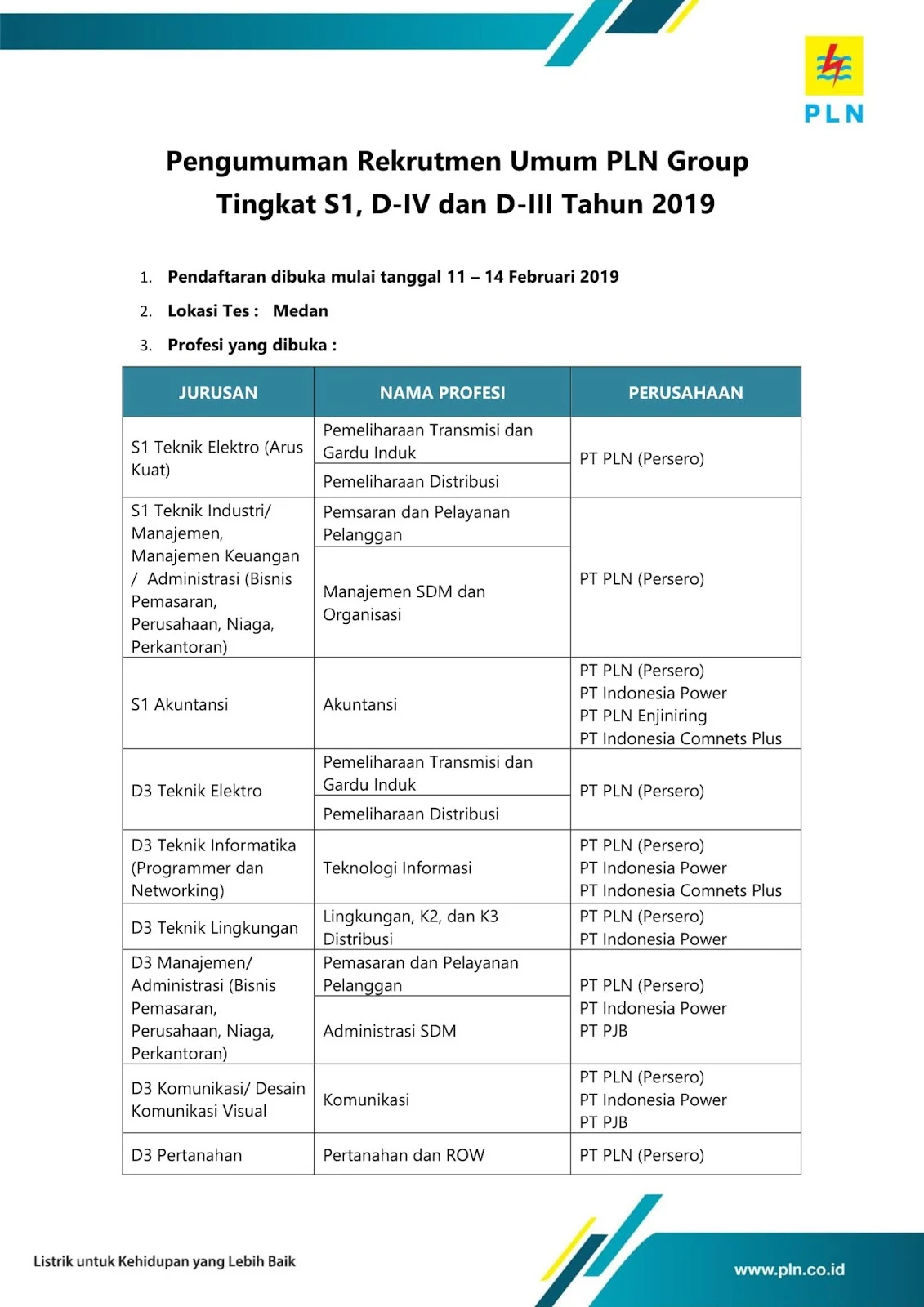 REKRUTMEN PLN GROUP TINGKAT S1/D4 & D3 (2019) - MEDAN