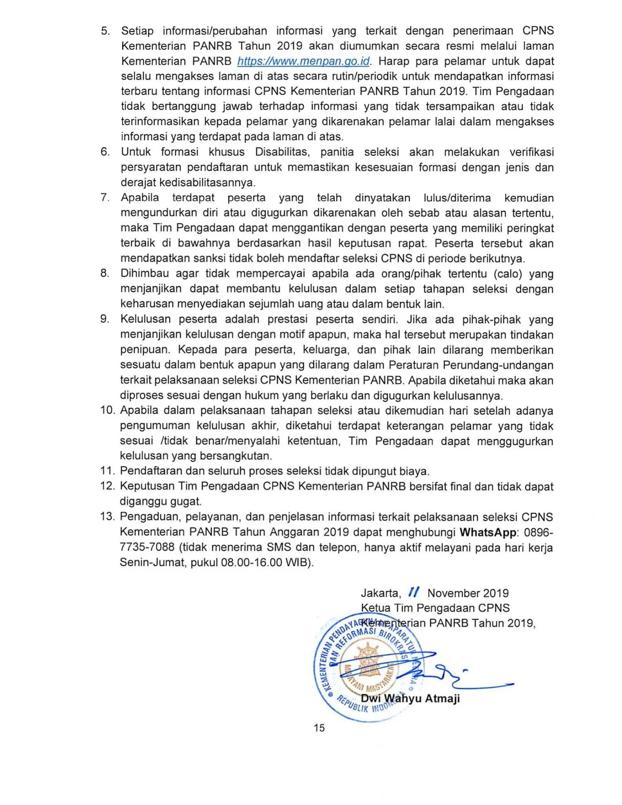 Berdasarkan Keputusan Menteri pendayagunaan aparatur negara dan Reformasi birokrasi Republik Indonesia Nomor 368 tahun 2019 tanggal 27 September 2019 tentang penetapan kebutuhan pegawai negeri sipil di lingkungan Kementerian kemenpan-rb Tahun Anggaran 2019 maka Kementerian pendayagunaan Aparatur Negara dan Reformasi birokrasi Republik Indonesia membuka kesempatan kepada warga negara Indonesia baik itu pria dan wanita untuk menjadi calon pegawai negeri sipil CPNS yang akan ditugaskan di lingkungan Kementerian Kemenpan RB dan Komisi aparatur sipil negara dengan ketentuan pada pengumuman berikut