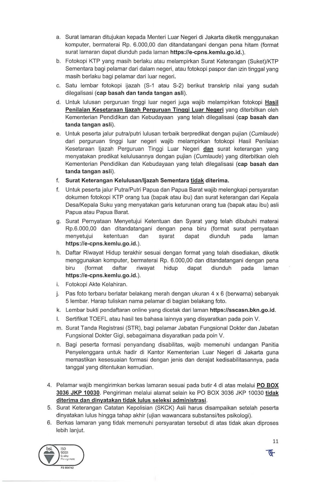 Berdasarkan Keputusan Menteri Pendayagunaan Aparatur Negara dan Reformasi Birokrasi Nomor 385 Tahun 2019 tentang Penetapan Kebutuhan Pegawai Negeri Sipil di Lingkungan Kementerian Luar Negeri Tahun Anggaran 2019, Kementerian Luar Negeri Republik Indonesia membuka kesempatan kepada Warga Negara Indonesia yang memiliki integritas dan komitmen tinggi untuk menjadi calon pegawai negeri sipI (CPNS) pada Kementerian Luar Negeri RI tahun anggaran 2019.