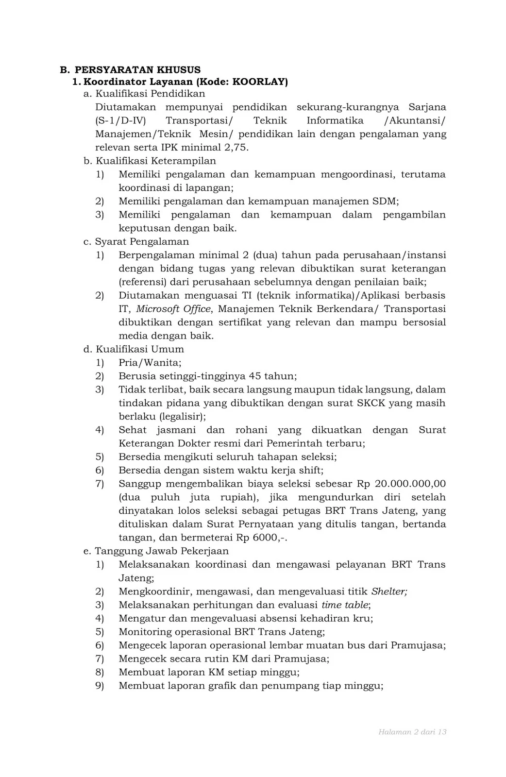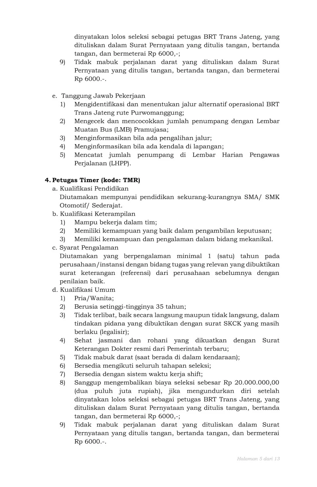 8) Sanggup mengembalikan biaya seleksi sebesar Rp 20.000.000,00 (dua puluh juta rupiah), jika mengundurkan diri setelah dinyatakan lolos seleksi sebagai petugas BRT Trans Jateng, yang dituliskan dalam Surat Pernyataan yang ditulis tangan, bertanda tangan, dan bermeterai Rp 6000,-.