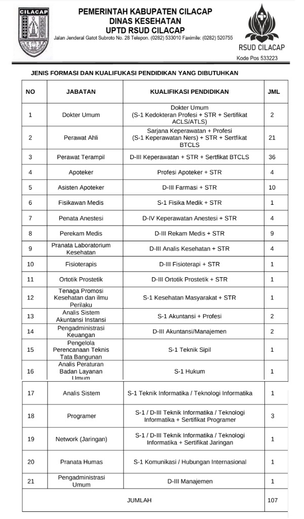 Adapun kualifikasi lowongan kerja yang dibutuhkan untuk posisi Pegawai BLUD Non ASN di RSUD Cilacap antara lain: